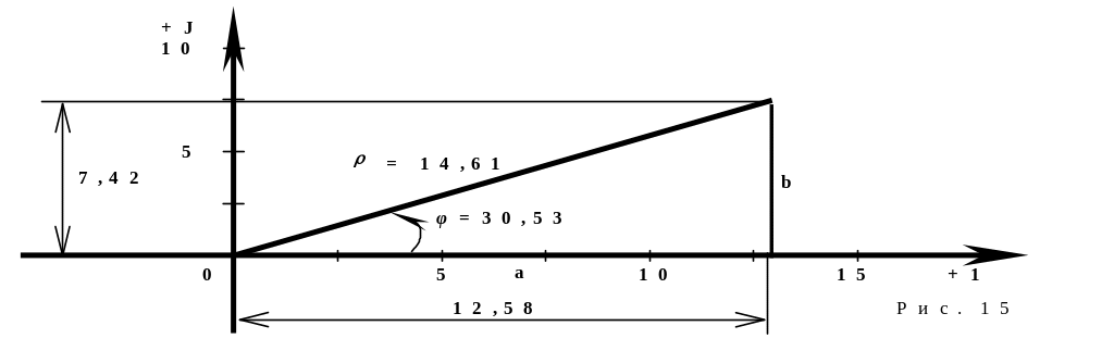 Представление расчетных параметров в комплексной форме позволяет без дополнительных вычислений перейти к построению векторной диаграммы токов на комплексной плоскости. Сначала изображаем треугольник полного сопротивления (рис 15), а затем вектор полного тока всей цепи (рис.16).