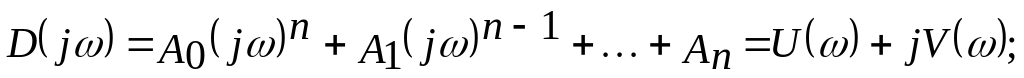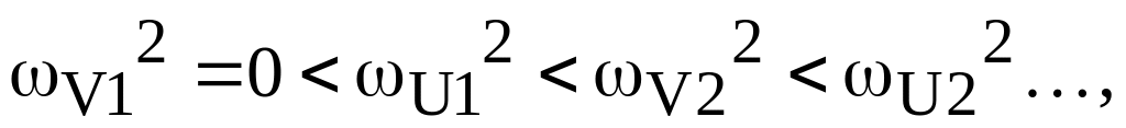 Иногда удобнее пользоваться другой формулировкой критерия Михайлова: для устойчивости замкнутой системы необходимо и достаточно, чтобы корни мнимой (полином V()) и действительной (полином U()) частей её характеристического вектора были вещественными положительными и чередовались (удобнее пользоваться выражениями для квадратов корней), т.е. выполнялись неравенства