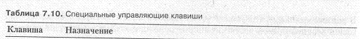 Специальные управляющие клавиши (их называют также служебными) расположены вокруг группы алфавитно-цифровых клавиш (табл. 7.10).