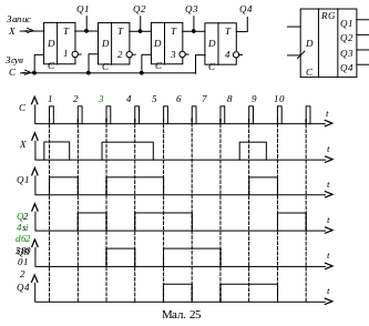 Розглянемо принцип роботи чотирьохрозрядного регістра зсуву на D-тригерах при записі двійкового числа 1011. Схемі послідовного регістра і часова діаграма, що ілюструє його роботу, приведена на мал. 25.