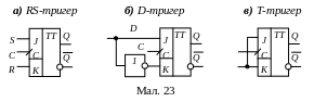 У сучасній апаратурі, елементною базою якої служать інтегральні мікросхеми, широко використовуються універсальні тригери типа JK, які залежно від способу включення входів можуть працювати як RS-, D- або Т-тригери (мал. 23).