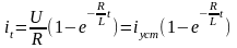 Перехідний електромагнітний процес у колі рис.1 при підключенні послідовно з'єднаних резистивно-індуктивних елементів до джерела постійної напруги описується рівнянням: