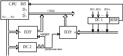 В начале этой подпрограммы в ячейках Х и Х+1 записана двухбайтная команда передачи управления по адресу А'. При попытке выбора микропроцессором адреса А' из ячейки Х+1 происходит следующее: дешифратор DC2, обнаружив, что адрес на шине = Х+1, формирует на выходе сигнал, запрещающий работу основной памяти, и отключает ее от системной шины данных. Одновременно по этому же сигналу разрешается работа дополнительной памяти ПЗУ*, и происходит ее подключение к системной шине данных.