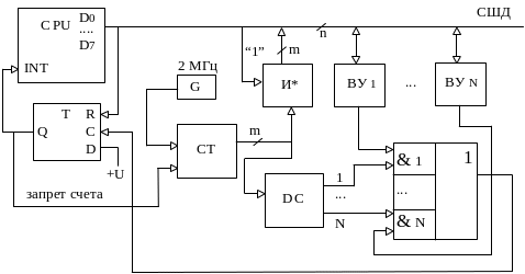 Таким образом, при получении хотя бы одного запроса от внешнего устройства, который поступает на вход приоритетного дешифратора DC1, на его выходе формируется сигнал запроса на прерывание для микропроцессора, который вызывает переход микропроцессора к фиксированной прерывающей подпрограмме.