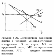 Во-вторых, при монополистической конкуренции отсутствуют какие-либо значительные ограничения на вход в отрасль других производителей и выход из нее. Поэтому на этих рынках экономическая прибыль и убытки не могут существовать долго. В долгосрочном периоде фирмы, терпящие убытки, предпочтут уйти из отрасли, а высокие экономические прибыли станут стимулом вступлений новых фирм в отрасль. Новые фирмы, производя близкую по характеру продукцию, получат свою долю рынка, и спрос на товары фирмы, получавшей экономическую прибыль, снизится (график спроса сместится влево). Сокращение спроса снизит экономическую прибыль всех фирм отрасли до нуля. Уравнение равновесия фирмы в долгосрочном периоде может быть записано следующим образом: MR=LMC=P>minLATC. Иными словами, долгосрочным девизом фирм, действующих в условиях монополистической конкуренции, является безубыточность. Ситуация долгосрочного равновесия показана на рисунке 6.36.
