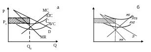 Во-первых, спрос на продукцию фирм, действующих в условиях монополистической конкуренции, не является абсолютно эластичным, однако его эластичность высока. Линия спроса на продукцию производителя будет иметь отрицательный наклон, поскольку на рынке продаются товары-заменители, что дает возможность получать монопольную прибыль в краткосрочном периоде. На рисунке 6.35 изображены кривые цены (спроса), предельного дохода, средних валовых и предельных издержек двух фирм, одна из которых максимизирует прибыль (а), а другая минимизирует убытки (б). Заштрихованными прямоугольниками показаны соответственно прибыль и убытки этих фирм.