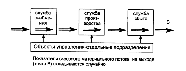 На микроуровне цепь, через которую последовательно проходит некоторый материальный поток, чаще всего состоит из различных служб одного предприятия (рис. 4). При традиционном подходе задача совершенствования сквозного материального потока внутри предприятия, как правило, не имеет приоритетного значения ни для одного из подразделений. Показатели материального потока на выходе из предприятия, так же как и в первом примере, имеют случайное значение и далеки от оптимальных.