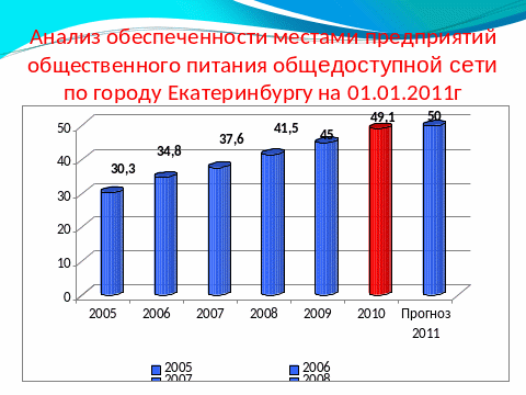 Развитие предприятий общественного питания происходит неравномерно. В центральных районах: Ленинский, Октябрьский, Верх-Исетский показатели обеспеченности превышают общегородской , в то время как в Орджоникидзевском ,Чкаловском данный показатель ниже в 1.6 раза