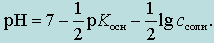 После математических преобразований выражение для расчета рН раствора соли, образованной слабой кислотой и сильным основанием, примет вид