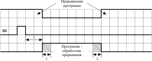 Рис. 14.1. Выполнение прерывания в компьютере: tр - время реакции процессора на запрос прерывания; tс - время сохранения состояния прерываемой программы и вызова обработчика прерывания; tв - время восстановления прерванной программы