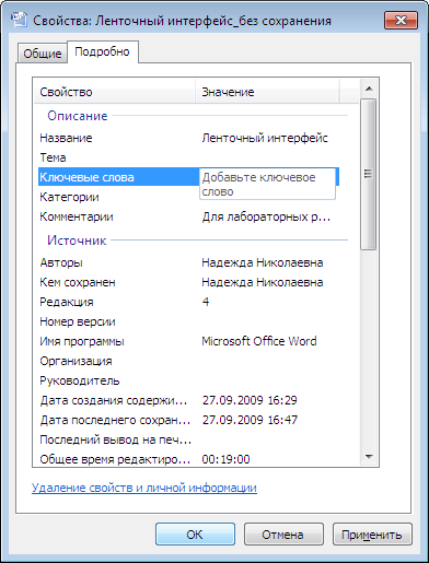 Кроме корешка «Общие» в окне диалога «Свойства» имеется еще корешок «Подробно», который показан на рисунке 28. Часть сведений о файле в этом окне диалога пользователь может заполнять самостоятельно. Например, давать название, тему, ключевые слова, определить категорию.