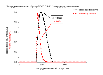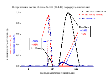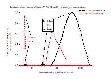 - частицы УДА обладают склонностью к агрегации (присутствуют достаточно крупные агрегаты), они дают больший вклад в интенсивность рассеянного света, чем мелкие. Однако, исходя из того, что интенсивность рассеянного на частице света пропорциональна ее площади, умноженной на отношение радиуса к длине волны падающего света, взятое в четвертой степени (Iрасс ~ R6), то оказывается, что мелких частиц в суспензии больше чем крупных, что и наблюдается на зависимостях, представленных выше;