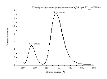 - •Спектры испускания и возбуждения флуоресценции уда