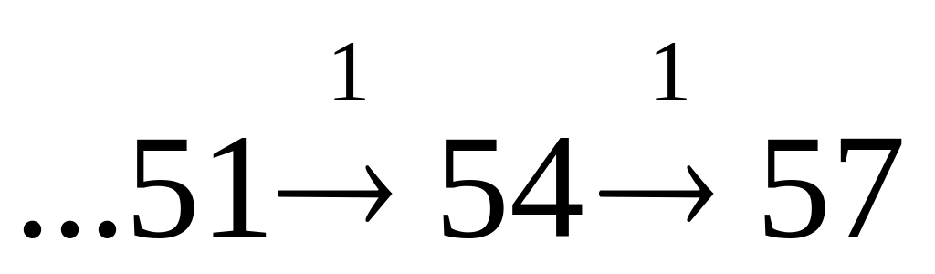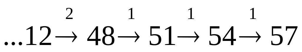 очевидно, что последней командой не может быть умножение на 4 (57 на 4 не делится), поэтому последняя команда – сложение (прибавь 3), над стрелкой записан номер команды: