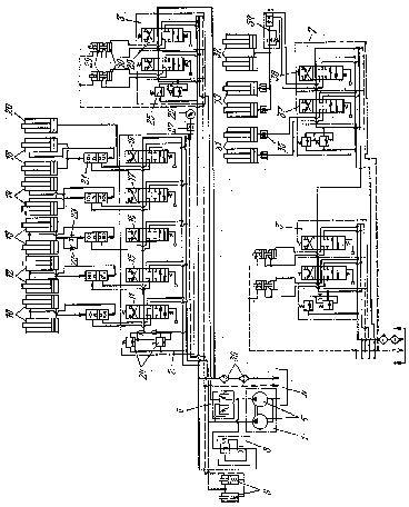 В блоке 2 для управления гидродомкратами 10 подъема и опускания носка питателя (стола) предназначен гидрораспределитель 11, гидродомкратами 12 раздвижки стрелы — гидрораспределитель 15, гидродомкратами 13 подъема и 14 поворота стрелы — гидрораспределители 16 и 17; опорными гидродомкратами 18 и гидродомкратами 20 отклонения хвостовой части скребкового конвейера — гидрораспределитель 19. В питающих магистралях гидродомкратов 10, 12, 13, 14, 18 установлены гидрозамки 21 для стабилизации рабочих положений. Дроссель 27 служит для регулирования скорости перемещения исполнительного органа, а плавное опускание регулируется обратным клапаном 22 и дросселем 23. Автостопоры 9 подключены к рабочей магистрали блока 2, они должны срабатывать при отсутствии давления.