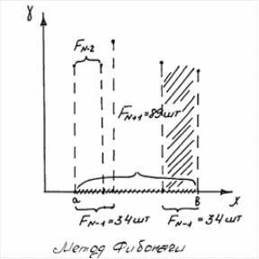 Интервал поиска делим на количество отрезков FN+1 (в примере, если N=10, то делим на 89 штук) и откладываем от концов интервала FN-1 штук. С полученными 4-мя точками поступают аналогично описанным выше методам.