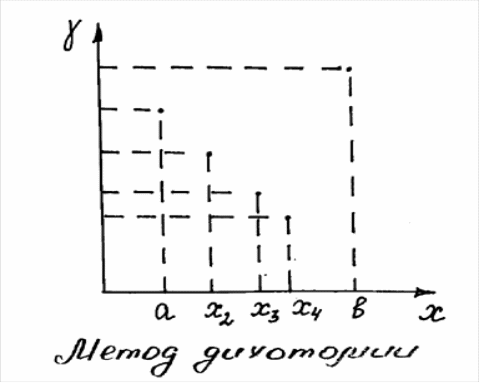 Отрезок ООФ делится пополам и одна из половинок снова делится пополам. Вычисляется значение ЦФ в четырех точках. В результате сравнения значений ЦФ часть области, не содержащая искомого экстремума, отбрасывается, а оставшаяся часть используется для дальнейшего поиска. Она также делится пополам и т.д. Достоинства: