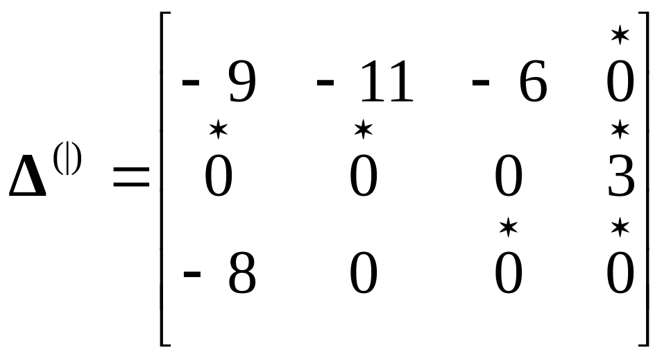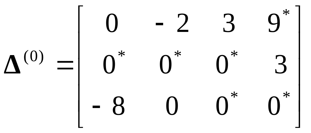 Для выяснения статуса нового решения находим матрицу оценок. С этой целью в (0) отмечаем элементы, соответствующие базисным в X(1), и строим цепочку выделения. Так как в строке с максимальной оценкой других отмеченных элементов нет, выделенной оказывается только первая строка. Вычитая из нее kr, получаем матрицу