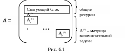Ответ очевиден: в тех случаях, когда сложность решения вспомогательной задачи намного ниже, чем исходной. Такие случаи имеют место, когда матрица условий задачи (после упорядочения строк и столбцов) оказывается почти-блочно-диагональной, как показано на рис. 6.1. Примером может служить задача планирования производства продукции в крупной фирме или холдинге, когда у каждого предприятия своя номенклатура продукции, а некоторые ресурсы являются общими. Подматрица А(0), входящая в параметры координирующей задачи, соответствует ограничениям по общим ресурсам. Такие условия называют связующими. Их относят к основной задаче.