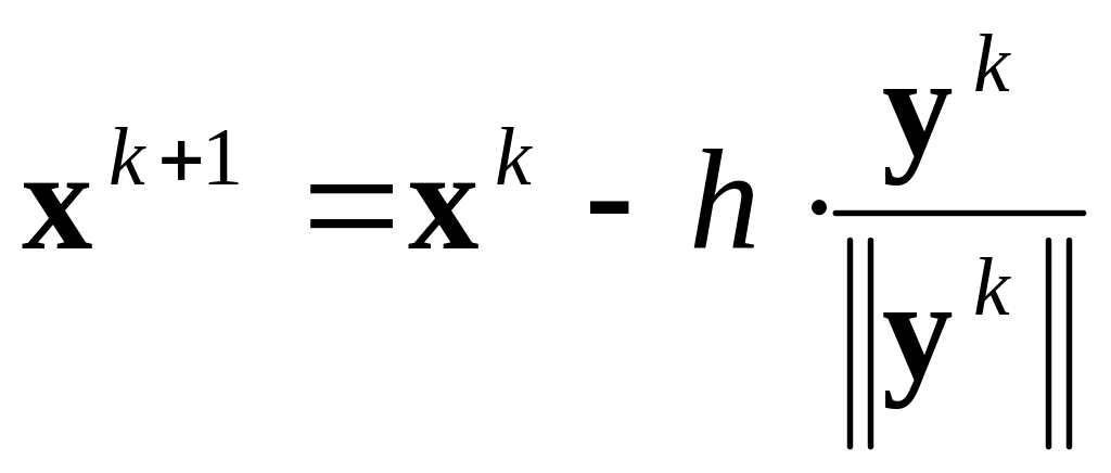 Проверить: а) если f(Xk+1)<f(Xk), положить k=k+1, i=1 и вернуться на 3; б) если f(Xk+1)f(Xk) и i<s, положить i= i+1 и вернуться на 3; в) если f(Xk+1)f(Xk), i=s и hk >, положить hk= hk/2, i=1 и вернуться на 3. г) если f(Xk+1)f(Xk), i=s и hk, поиск закончить, приняв Xk за точку минимума.▲