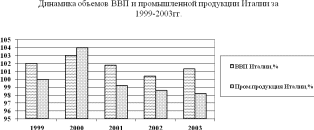 В 1999 год наблюдается преимущество в Италии ВВП над промышленной продукцией на 2% (ВВП - 102%, промышленная продукция - 100%); такая же ситуация сложилась и в период с 2001 по 2003 годы: ВВП опережает промышленную продукцию на 2,6%, 1,8% и 3,1% соответственно.