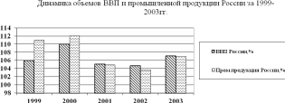 В объемах промышленной продукции России с 1999 по 2003 гг. прирост составил 11%, 12%, 4,9%, 3,7%, и 7% соответственно. Отсюда можно сделать вывод, что динамика показателей ВВП и промышленной продукции за период 1999-2003 гг. в России положительная.