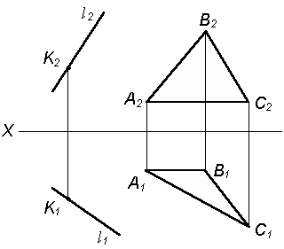 1. Известно, что для построения прямой, перпендикулярной плоскости, необходимо построить горизонталь и фронталь в плоскости. а) Заметим, что построение перпендикуляра упрощается, так как стороны плоскости Q( АВС) являются прямыми уровня: АВ (А1В1; А2В2) – фронталь АС (А1С1; А2С2) – горизонталь. б) Возьмем на прямой l произвольную точку К |
