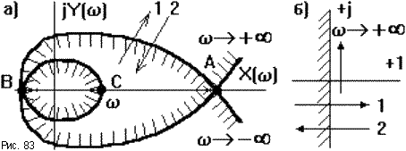 Если в плоскости корней двигаться вдоль мнимой оси от - до + и штриховать ее слева (рис.83б), то это будет соответствовать движению вдоль линии D-разбиения при изменении w от - до + и штриховке ее также слева. Переходу корня в плоскости корней из штрихованной полуплоскости в нештрихованную вдоль стрелки 1 соответствует аналогичный переход через границу D-разбиения вдоль стрелки 1, и наоборот. Если пересекается область с двойной штриховкой (точкиA, В, C), то в плоскости корней мнимую ось пересекает пара комплексно сопряженных корней.