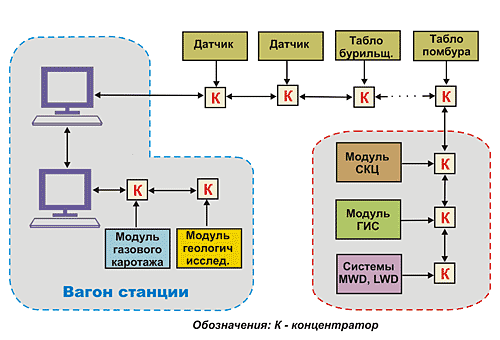 30. Структура станции приведена на рис. 1. Она построена на принципе распределенных удаленных систем сбора, которые объединены между собой с использованием стандартного последовательного интерфейса. Основными низовыми системами сбора являются концентраторы, предназначенные для развязки последовательного интерфейса и подключения через них отдельных составных частей станции: модуля газового каротажа, модуля геологических приборов, цифровых или аналоговых датчиков, информационных табло. Через такие же концентраторы к системе сбора (на регистрирующий компьютер оператора) подключаются и другие автономные модули и системы - модуль контроля качества крепления скважин (блок манифольда), наземные модули забойных телеизмерительных систем, систем регистрации геофизических данных типа «Гектор» или «Вулкан» и т.д.