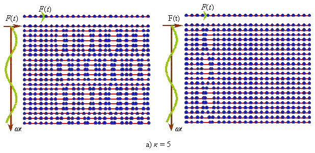 Диаграммы вынужденных колебаний в конечной однородной упругой линии с незакрепленными концами при воздействии внешней силы на внутренние элементы линии.