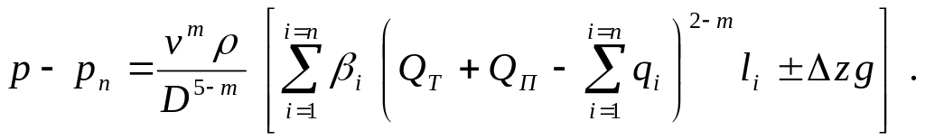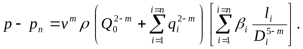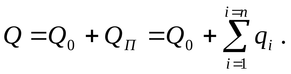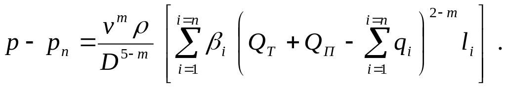 где Q - объемный расход жидкости в произвольном сечении; QT - транзитный расход жидкости, т. е. расход, который транспортируется за пределы указанных участков; QП - путевой расход жидкости; q1, q2, …. , qi - равные или неравные объемные расходы жидкости в ответвлениях, отстоящих на расстоянии l1, l2, …. , li от начала трубопровода.