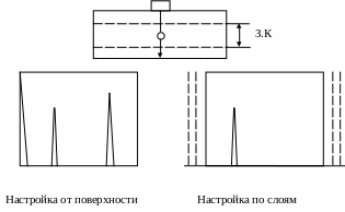 Настройка по слоям выполняется, когда необходимо вывести за экран все возможные ложные сигналы и выделить только контролируемый участок. При настройке от поверхности масштаб развертки устанавливают кратным 5-10, при котором донный сигнал находится в конце развертки (8-10 клетка).