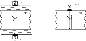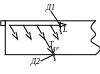 При установке ПЭП по внешнему периметру, необходимо учитывать явление трансформации и возможность выявления дефектов, не только прямым эхо-сигналом (Д1), но и трансформированным (Д2). При контроле с торца одновременно с эхо – методом, применяют зеркально-теневой метод.