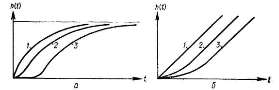 Рисунок 2. Переходные функции объектов с самовыравниванием (а) и без самовыравнивания (б): 1 – без запаздывания; 2 – с емкостным запаздыванием; 3 – с емкостным и чистым запаздыванием.