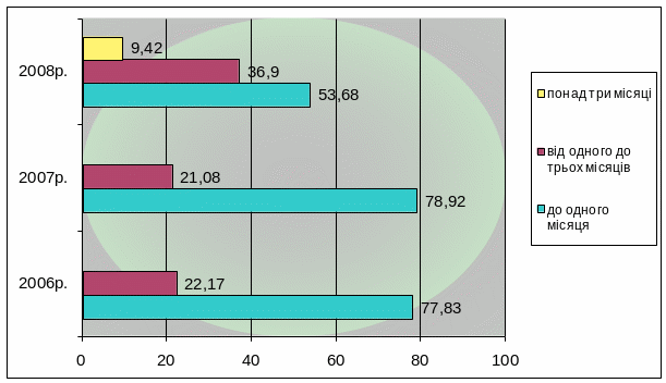 В 2008 році значно скоротилася дебіторська заборгованість за товари та послуги віком до одного місяця і становила 17,71 тис. грн. або 53,68% в загальній структурі заборгованості. В аналізованому періоді заборгованість за товари склала лише 8,51 тис. грн., а дебіторська заборгованість за послуги – 9,2 тис. грн. Дещо знизилась вартість дебіторської заборгованості зі строком виникнення від одного до трьох місяців: заборгованість за товари рівна 5,95 тис. грн.(18,03%), заборгованість за послуги – 6,22 тис. грн., або 18,87%. Загальна ж вартість дебіторської заборгованості за товари, роботи, послуги строком виникнення від одного до трьох місяців становить 12,17 тис. грн. (36,9%). В 2008 році з’явилася дебіторська заборгованість за товари віком понад три місяці, що є негативним моментом в діяльності Катеринопільського РСТ. Її частка є незначною 3,1тис. грн. або 9,42%, але вона спричиняє найбільш негативний вплив на формування грошових коштів підприємством та є найбільш небезпечною.