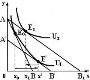 Однако, как уже отмечалось, общий эффект делится на эффект замены и эффект дохода. Чтобы определить величину эффекта замены, проведём вспомогательную бюджетную линию A'B', параллельную новой бюджетной линии AB1 и касательную к кривой безразличия U1. Эта бюджетная линия отражает новое соотношение цен товаров X и Y, и в то же время точка касания этой линии с кривой безразличия U0 – точка воображаемого оптимума E' – характеризуется тем же уровнем реального дохода потребителя, что и точка первоначального оптимума E0. Таким образом, при движении от точки E0 к точке E' уровень реального дохода потребителя остаётся тем же и изменение объёма спроса потребителя на товар X вызывается исключительно изменением соотношения цен товаров X и Y, поэтому (x'-x0) – представляет собой эффект замены.