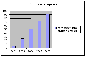 Сегмент единичных кофеен в Москве растет не больше чем 10 % в год, в то время как весь рынок не меньше 20% (по данным аналитиков ИК Финам), а также эксперты считают, что будущее скорее всего за сетевыми проектами. На сегодняшний день на них приходится 60 % от общего числа, а остальные 40% приходятся на одиночные заведения ( из маркетинговых исследований РА “Оскар”). На данный момент емкость рынка кофеен (по данным маркетингового агентства “Step by Step”) составляет 2000 заведений, а в Москве на ноябрь 2007 года по оценкам экспертов, насчитывается 300 кофеен. Однако в последние годы новые игроки в этом сегменте появляются очень редко. 14