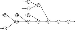 1. Построение матрицы следования операций (табл. 6.2). Здесь 1 соответствует операции, которая должна непосредственно следовать за рассматриваемой, а 0 – отсутствие отношения непосредственного следования между парой операций. Например, операция 10 должна следовать за операциями 3 и 4или обратно, операции 3 и 4 должны предшествовать операции 10.