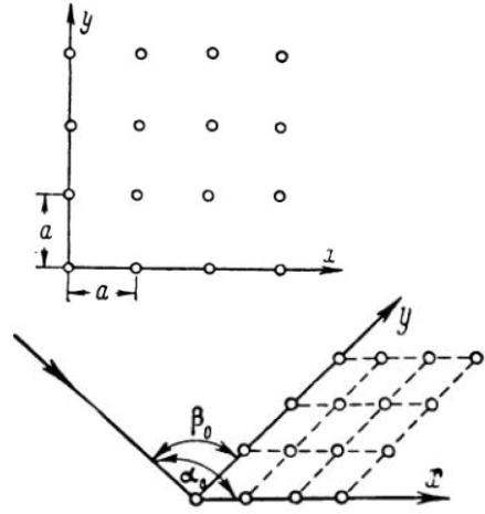 • Следующий шаг: расположим рассеивающие волну атомы в виде двумерной структуры – квадратной решетки в плоскости xy . →