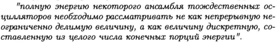 • Если осцилляторы находятся в равновесии с излучением, то свойство дискретности энергии относится и к излучению соответствующих частот – ведь энергия излучения передается им от вещества (осцилляторов). Получается, что она передается им только дискретными порциями, а
