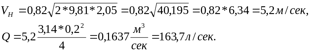 Получив величину расхода Q = 163,7 л/сек, вычислим скорость движения жидкости в трубе и цилиндрическом насадке по следующей формуле: