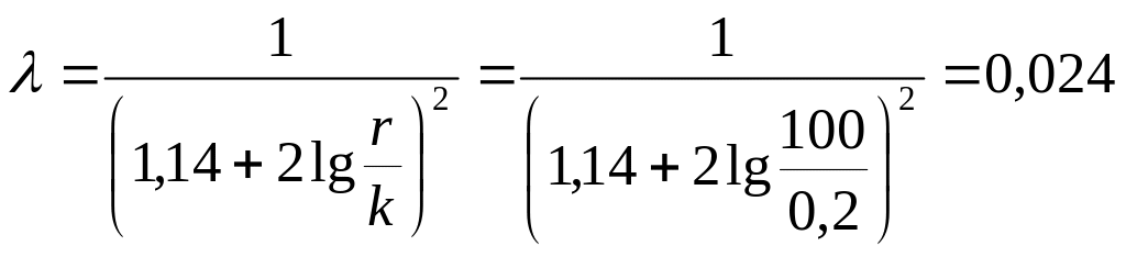 что почти совпадает с принятой выше величиной = 0,025, ввиду чего пересчет делать не требуется. В последней формуле r – радиус трубы, k – коэффициент абсолютной шероховатости стенок трубы.