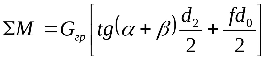 При подъеме груза необходимо преодолеть сумму моментов от веса груза, сил трения в резьбе и сил трения на опорной поверхности поворотной головки винта:
