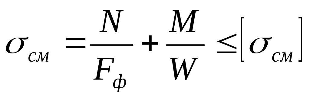 где Г – давление на грунт, Па N – нагрузка, Н Fф - опорная площадь машины, м2 Qф – масса фундамента, кг М – опрокидывающий момент, Нм е – эксцентриситет, м W – момент сопротивления сечения, м3 |
