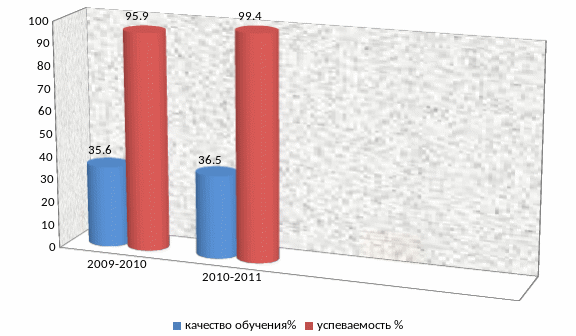 В целом по школе уровень результативности за 2010-2011 учебный год составил 99,4%, качество знаний 36,5%, что выше показателей предыдущего учебного года.