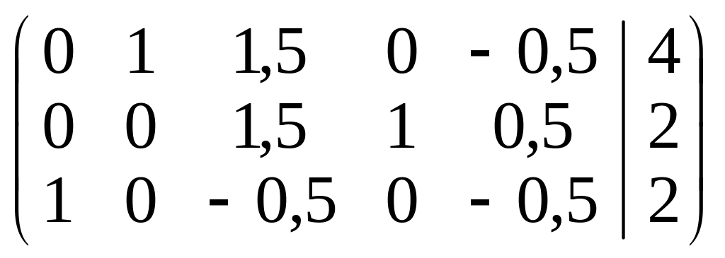 Приведем первый столбец к виду (0, 1, 0). Разделим вторую строку на 1,5. Затем получившуюся строку, умножив на 0, 5, прибавим к первой и, умножив на –1,5, прибавим к третьей.