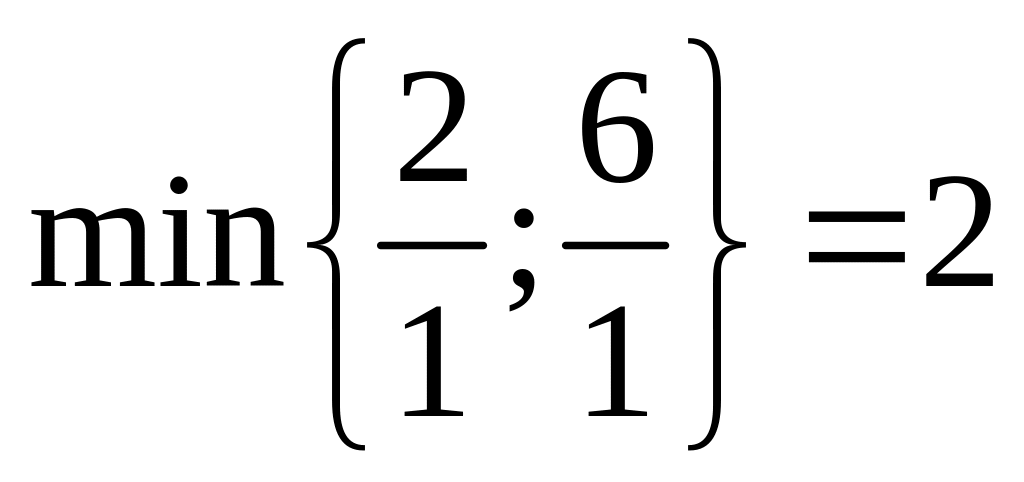 В качестве второй базисной переменной можно взять x4, тогда последнюю базисную переменную нужно выбрать из x1 или x2. Составим отношения (2.8) для каждого из этих столбцов:
