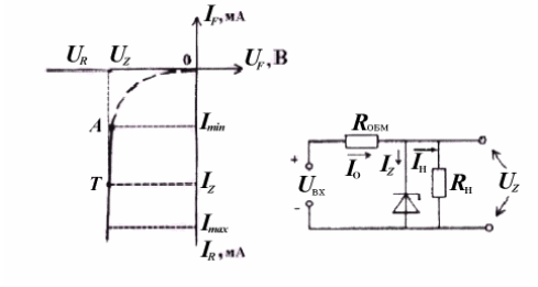 Вольт-амперна характеристика напівпровідникових діодів в області електричного пробою має ділянку, яка використовується для стабілізації напруги. Така ділянка у кремнієвих площинних діодів відповідає зміні зворотного струму в широких межах. До початку пробою зворотний струм дуже малий, а в режимі пробою, тобто в режимі стабілізації, він стає таким, як і прямий струм. В наш час випускають виключно кремнієві стабілітрони багатьох типів. Їх також називають опорними діодами, тому що стабільну напругу, яку від них отримують, у ряді випадків використовують як еталонну. На рис. 3.1, а дана типова ВАХ стабілітрона при зворотному струмі, яка показує, що в режимі стабілізації напруга змінюється мало. Характеристика прямого струму стабілітрона така ж, як і у звичайних діодів. У точці А, де пробій є достатньо стійкий, струм різко зростає, допустиме його значення Imax обмежується лише допустимою потужністю розсіювання.