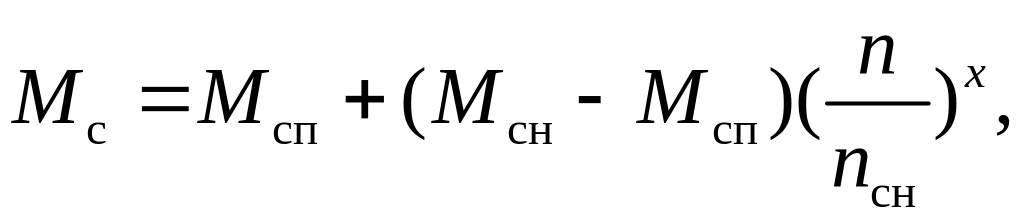 где Мсп – начальный пусковой момент сопротивления, зависящий от трения, состояния смазки, начальной нагрузки и т.п.; Mcн – момент сопротивления нагрузки при номинальной частоте вращения nсн; x – характеристический коэффициент, зависящий от вязкости рабочего тела и скорости его перемещения (газ, вода, масло и т.п.), n-текущее значение частоты вращения.