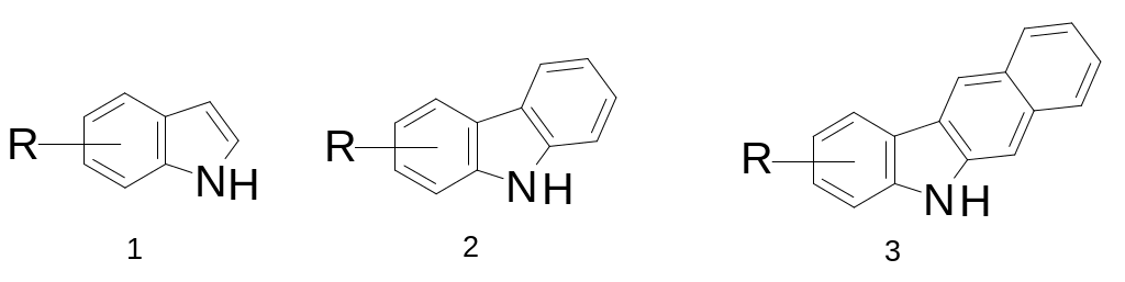 1 – Алкилиндол, 2- алкилкарбазол, 3- бензоалкилкарбазол.